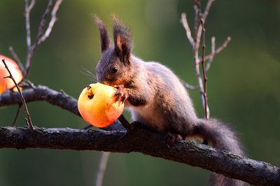 松鼠听了我的话,果然又盘旋着下来,这次它蹲坐在一根离地面不远的树枝上,拉开随时都要逃走的架势,它的腮鼓鼓的,那里面是它不久前嗑好的松籽仁。松鼠的腮是它随身的兜囊,等实在装不下食物的时候,它才会回一趟巢穴。现在,它随着我相机的快门声不断变换姿势,像一个妖冶的精灵。